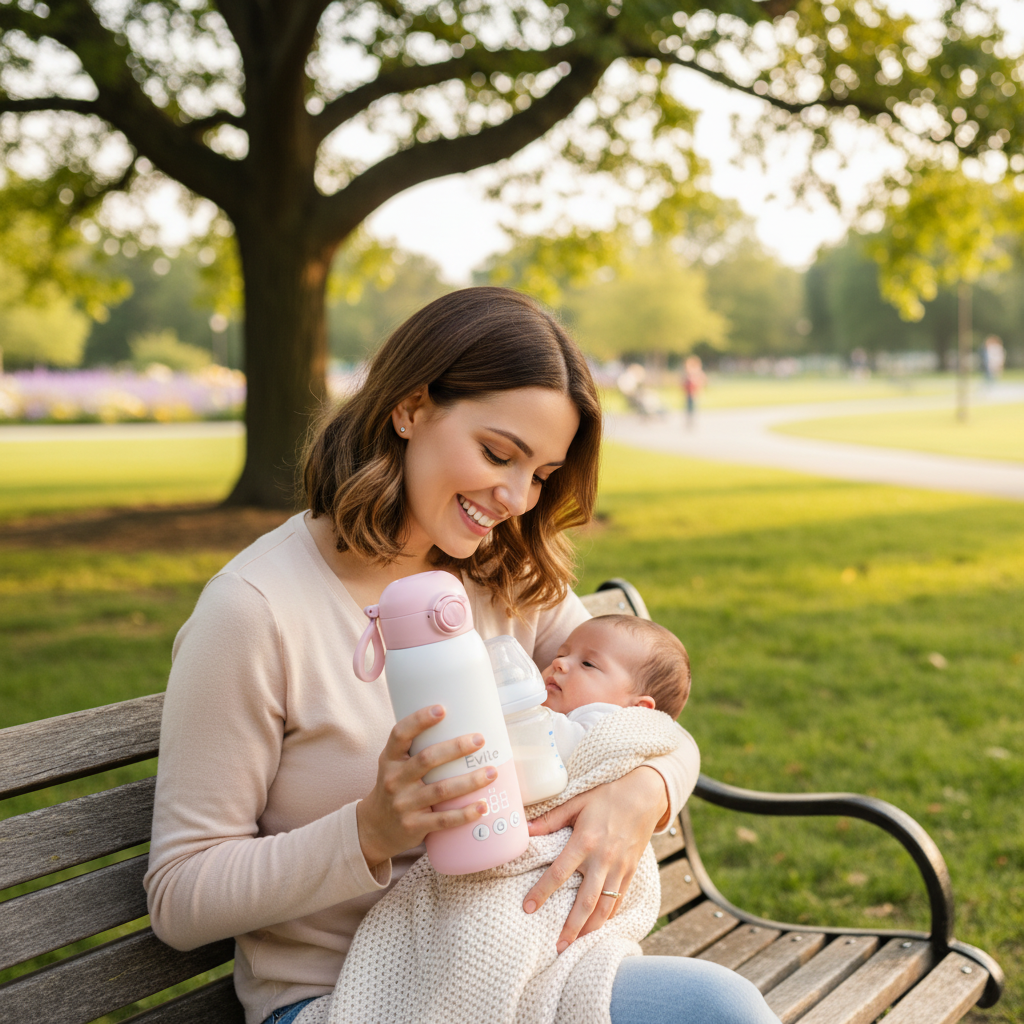 De Evite Portable Bottle Warmer is ontworpen voor moeders die rust, gemak en verfijnd design waarderen. Hij verwarmt flesjes snel en veilig, is draadloos én krachtig.